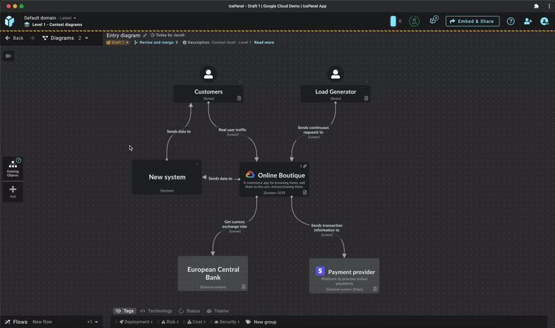 In IcePanel, you can design your future changes using Drafts, an option on a diagram to propose changes without affecting the current model. With Drafts, you can create design proposals starting from your current model, but the changes don't affect your current model until you merge these changes. Paired with Tags to showcase your future version changes, you can show exactly where you're going separately from the current design.