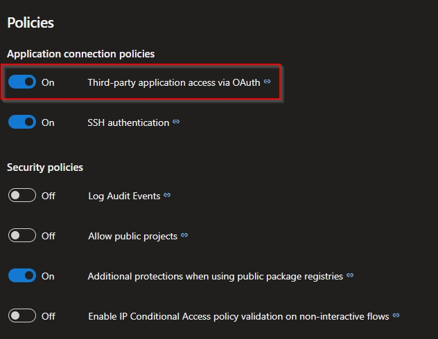 If after connecting your Azure DevOps IcePanel shows that you have no code repos, try enabling "Third-party application access via OAuth" in your security policies.